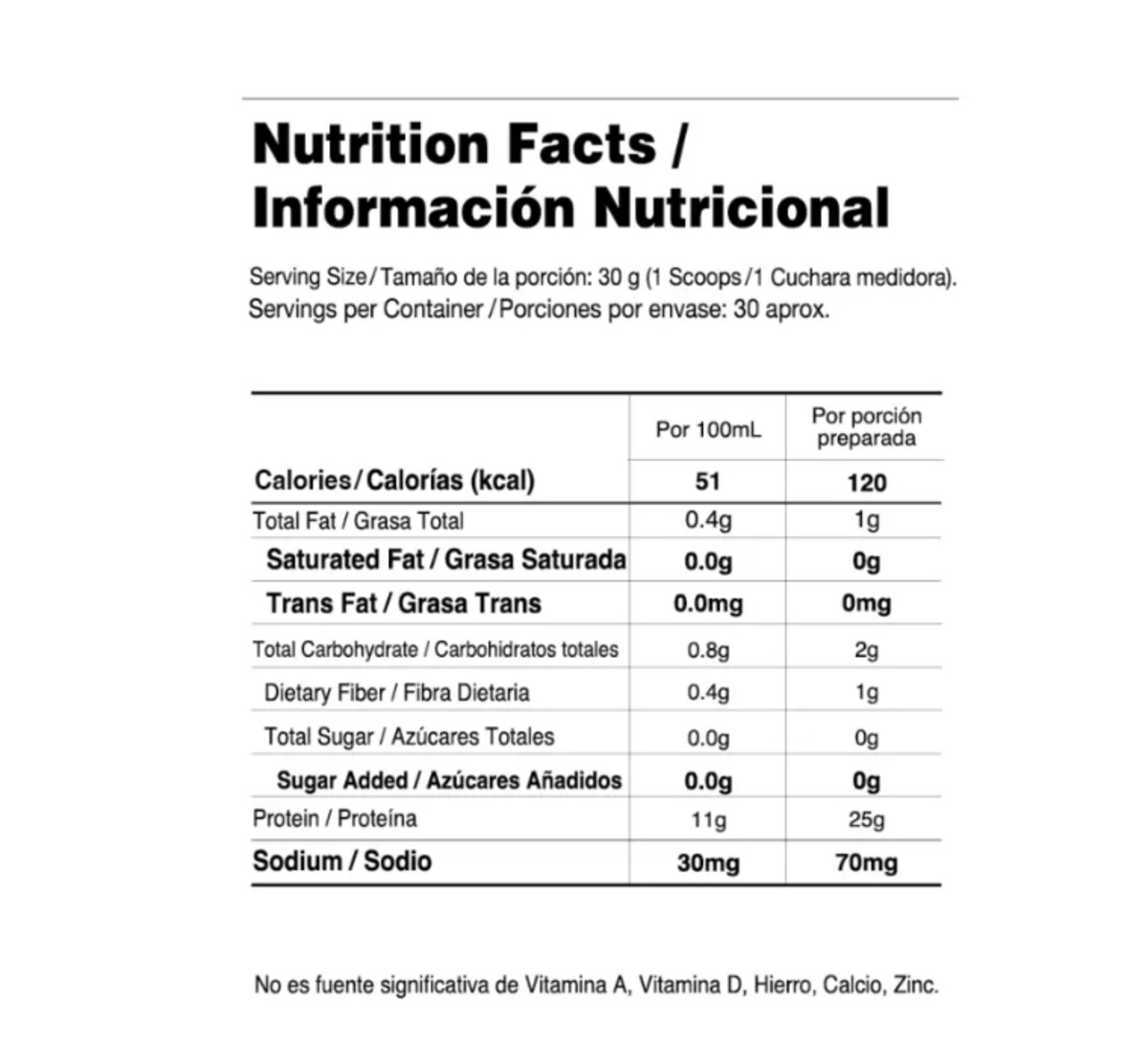 Cada servicio contiene: 25 g de proteína concentrado y aislado. 2 g de carbohidratos. 1g de grasa totales. 0 azúcar. 5g BAA´s 5 g Glutamina. Nutraflora® (prebióticos) y Lactospore® (probióticos).